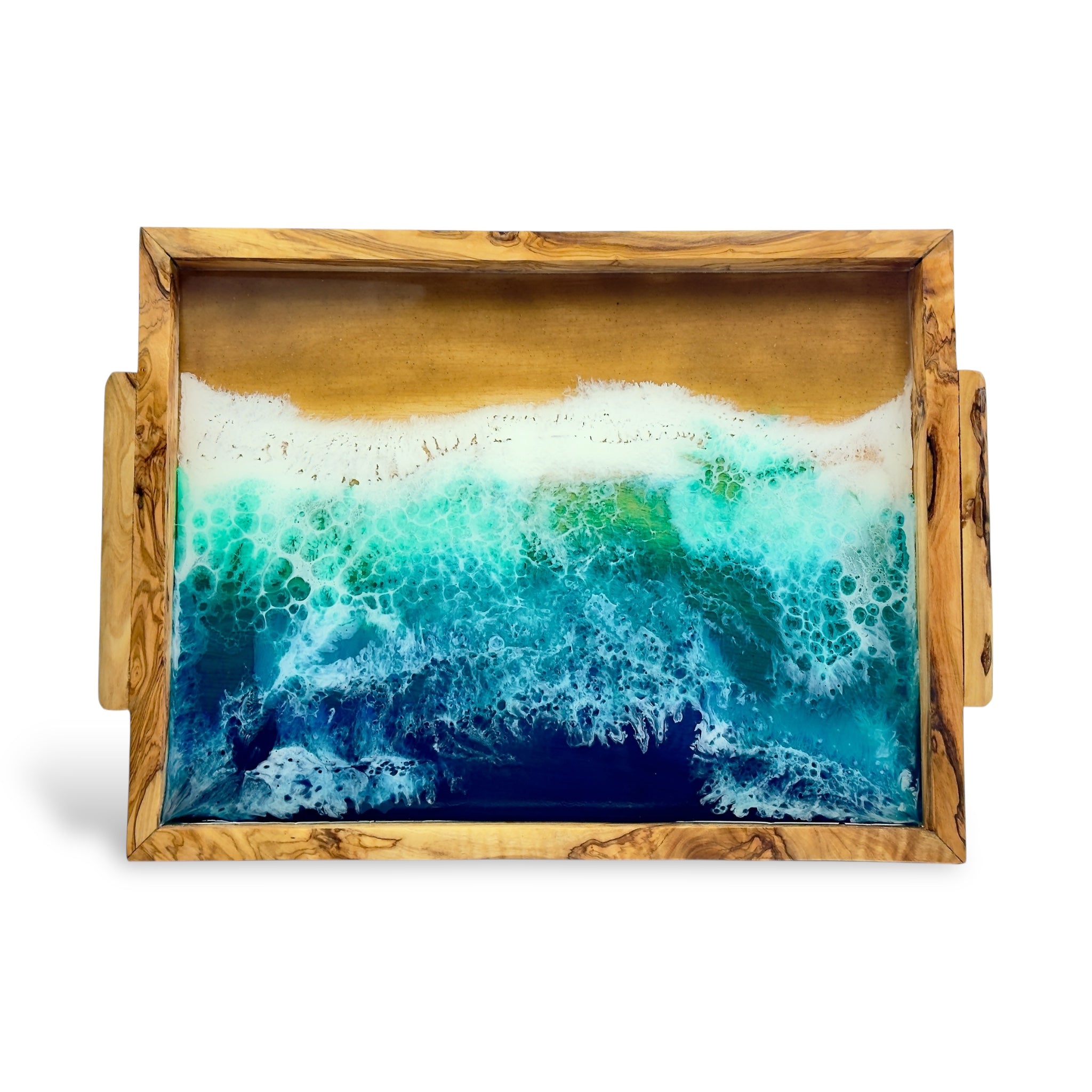 Our Olive Wood & Ocean Epoxy Serving Tray (17" L x 13" W x 1.5" H, 18.25" W with Handles) is a functional work of art. Framed in rich olive wood with ergonomic handles, this tray features a stunning ocean-inspired epoxy center that brings the beauty of nature to your table.